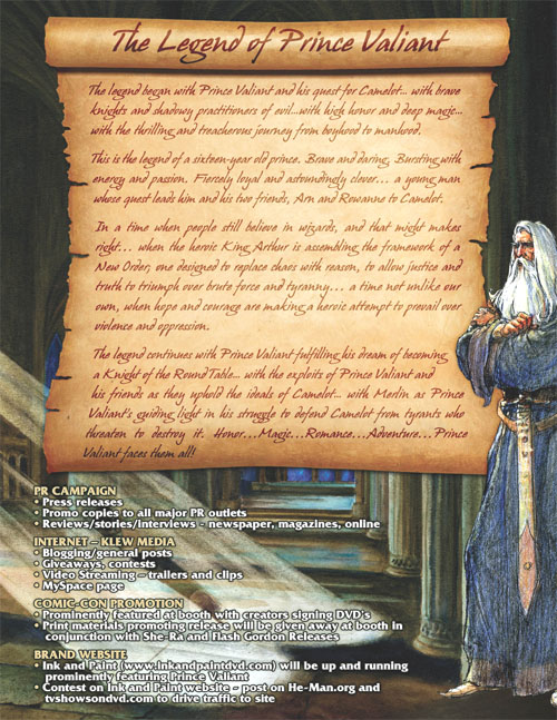 Los Angeles, CA One of the animation worlds oldest, most classic characters is heading to DVD for the first time as BCI, a wholly-owned subsidiary of Navarre Corporation, in its initial venture with Hearst Entertainment, will release The Legend of Prince ValiantThe Complete Series, Volume One on July 4th, at a suggested retail price of $29.98. This 33 episode, five-DVD set is the first of two volumes (a total of 65 episodes) to be released under BCIs newly-created Ink and Paint Brand which will focus on licensed animated content, and is the first in a full line of titles licensed from the Hearst catalog. The announcement was made today by Jeff Hayne, Director of Acquisitions, BCI.